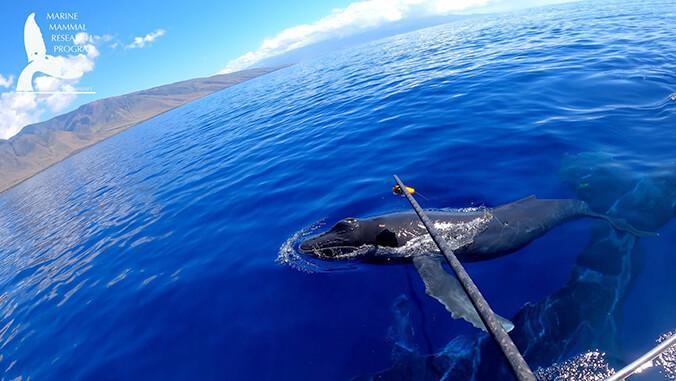 image: UH researchers tag a humpback whale calf off of Maui (NOAA permit #21476)