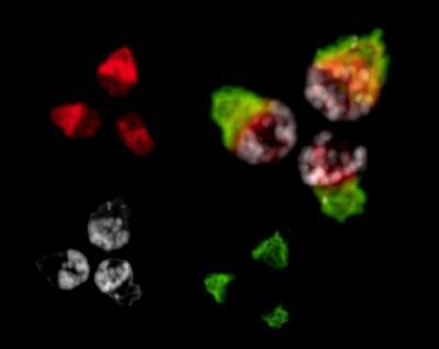 Fluorescent images of C. elegans sperm. Shown in red are GSP-3/4, phosphatases required for fertility, white are membranous organelles and green is major sperm protein, a C. elegans protein important for motility. GSP-3/4 is shown to be an important regulator of MSP in the Wu et al. paper.