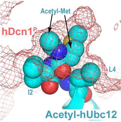 But a major question was how human Dcn1 and Ubc12 interact. The breakthrough came when the researchers realized that Ubc12 is among the 35 to 50 percent of proteins in which methionine is the amino acid involved in N-terminal acetylation. The investigators used a variety of laboratory techniques to demonstrate that the acetylated methionine of Ubc12 was essential to the Ubc12-Dcn1 interaction. Evidence included an X-ray image that shows Ubc12's acetyl-methionine buried in a pocket on the surface of Dcn1.