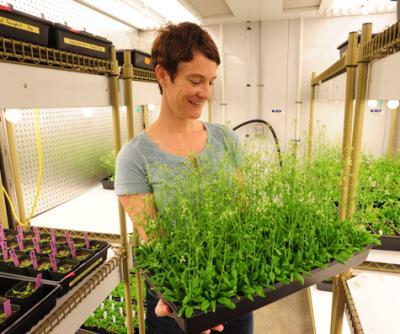 Elizabeth Haswell, Ph.D., assistant professor of biology in Arts & Sciences at Washington University in St. Louis, in a growth chamber with her "lab rats," Arabidopsis plants she uses to understand how plants respond to touch, gravity and other mechanical forces. If wild-type Arabidopsis plants are touched frequently. their growth is stunted.