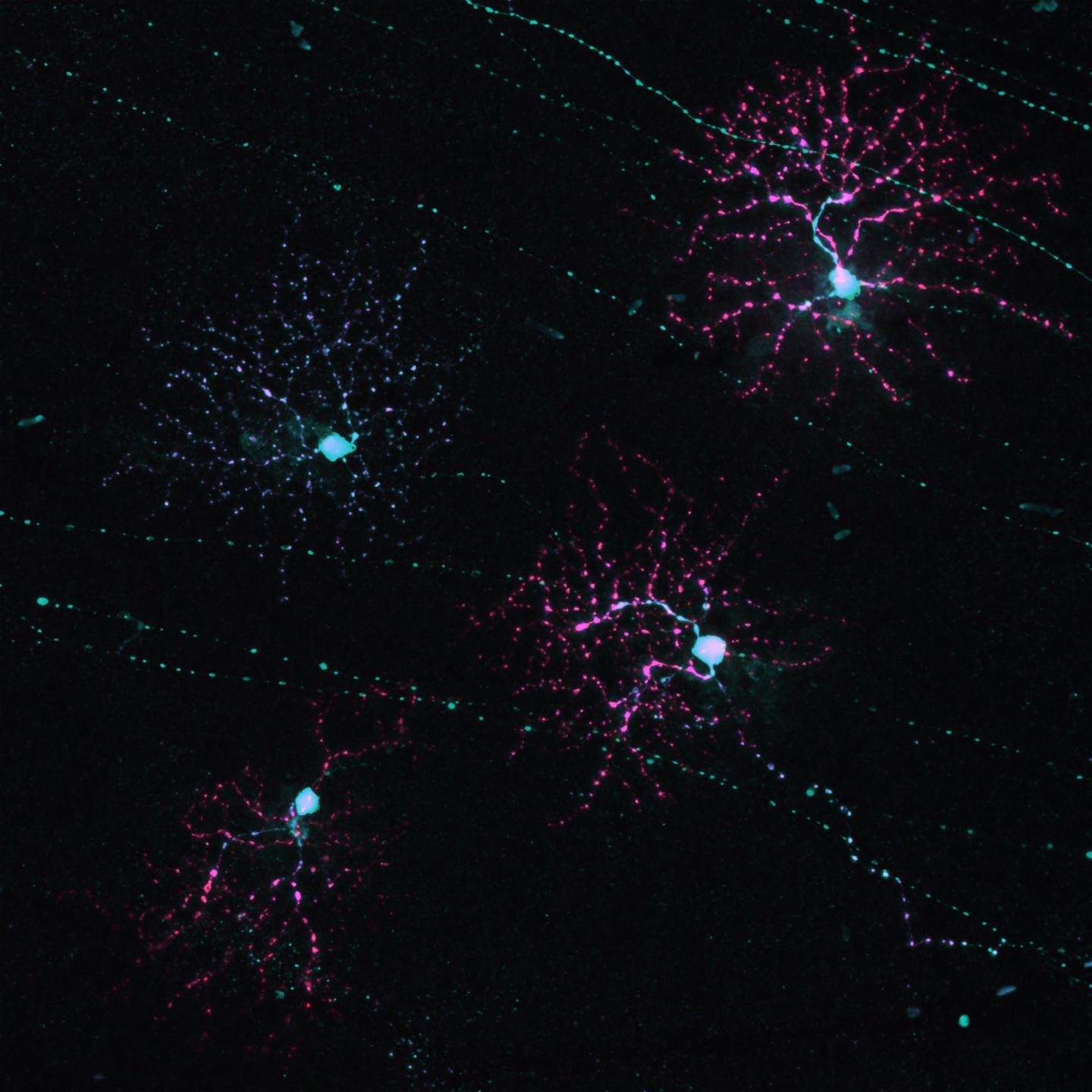 image: This image from a confocal microscope shows four retinal ganglion cells, the cells that send a signal from the retina to the brain.