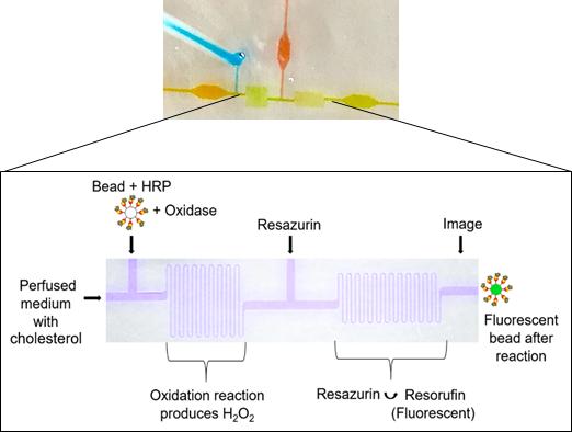 "While the application of detection systems for biomolecules such as electrophoresis, mass spectroscopy, electrospray ionization, and fluorometric detection using a photomultiplier tube have been carried out in the past, this is the first time a non-protein molecule has been quantified in real-time and on-chip using immobilized enzyme beads. It's the simplicity of the assay chemistry and its potential for adaptation that makes our microfluidic assay unique", says Sonali Karnik, Ph.D. who is the lead author of the article.