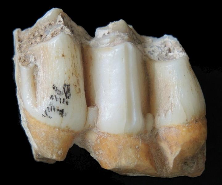 image: Fossil teeth of an eld's deer (Rucervus eldii) from the Tam Ham Marklot cave's fossil assemblage. This species of deer is still found today in Southeast Asia, and Laos specifically. The area that was sampled for zinc isotope analyses, a long vertical groove, can be seen on the central teeth's cone.