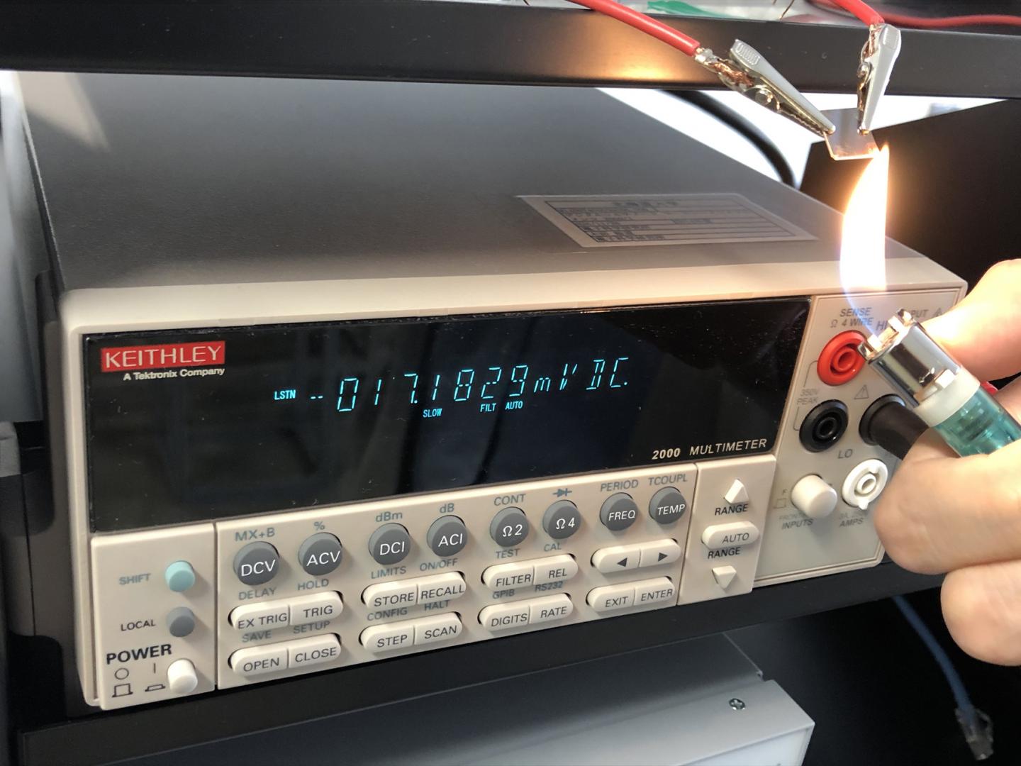 image: The barium-cobalt oxide film (top right, approximately 1 cm2) being exposed to an open flame to generate voltage. (Photo: Hiromichi Ohta)