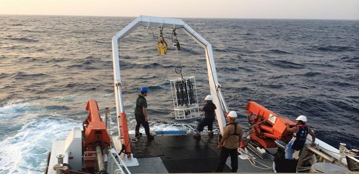 image: A CTD (a probe measuring temperature, salinity and depth) and rosette sampler is brought on board the RV Thuwal to collect water samples from the surface down to 700 meters at a station off King Abdullah Economic City.