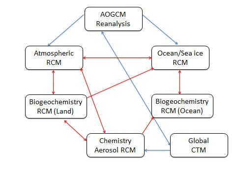 image: Schematic depiction of a coupled RESM framework and the interactions across its different components and global climate model drivers (CTM: chemical transport model). Arrows indicate the flow of information. Blue arrows: interaction with driving global models; red arrows: interaction inside the RESM.