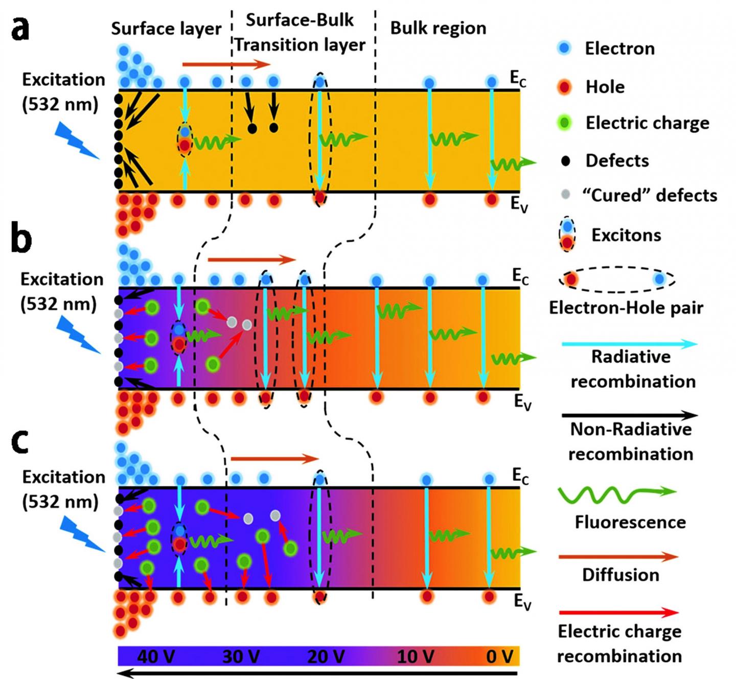 These scientists summarize the operational principle of the voltage regulation engineering: "The voltage regulation engineering as an efficient strategy can regulate the defects in perovskites and influence its dynamic carrier transport. The injected charges act as a Lewis base can be trapped by lead defects in the surface layer and further passivate the deep-level donor-like defects inside the perovskites. Thus, these "cured" defects no longer trap carriers, and the probability of radiation recombination in perovskites is enhanced, which further improve its optical and electrical properties."