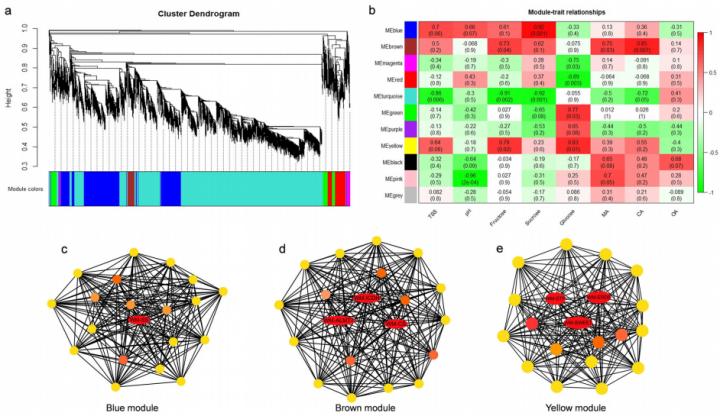 The sensory quality of watermelon fruit is determined by the content of sugar and organic acid, which determines the taste of watermelon during the development and maturation of watermelon fruit. The sweet watermelon '203Z' and sour watermelon 'SrW' of its isogenic line were used as materials, the genes and gene networks co-expressed with glycolic acid metabolism were searched through WGCNA analysis of transcriptional and metabolite data. Three gene expression networks were identified, including 2443 genes that were highly correlated with sugar and organic acid metabolism in watermelon fruits. Seven key genes involved in sugar and organic acid metabolism of watermelon fruits were screened by significance and qRT-PCR analysis. Among them, Cla97C01G000640, Cla97C05G087120 and Cla97C01G018840 were sugar transporters. Cla97C03G064990 was a sucrose synthase. Cla97C07G128420, Cla97C03G068240 and Cla97C01G008870 were highly correlated with malic acid and citric acid, which were the transporters and regulators of malic acid and citric acid. These genes were verified in the natural population, and the results showed that the expressions of these 7 genes were significantly positively correlated with the contents of sugar and organic acid in watermelon fruit.