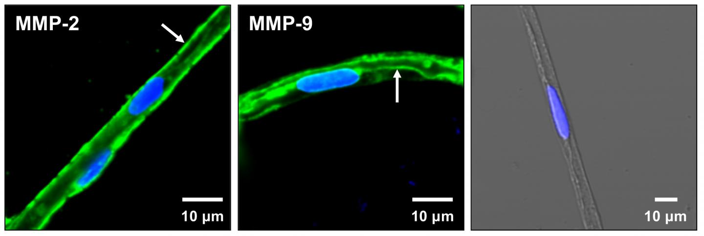 image: This is the representative immunostaining for MMP-2 (left), MMP-9 (middle) and the negative control (right; overlay of green, blue and transmitted light channels) in isolated rat brain capillaries. MMPs are shown in green; nuclei were counterstained with DAPI (blue).