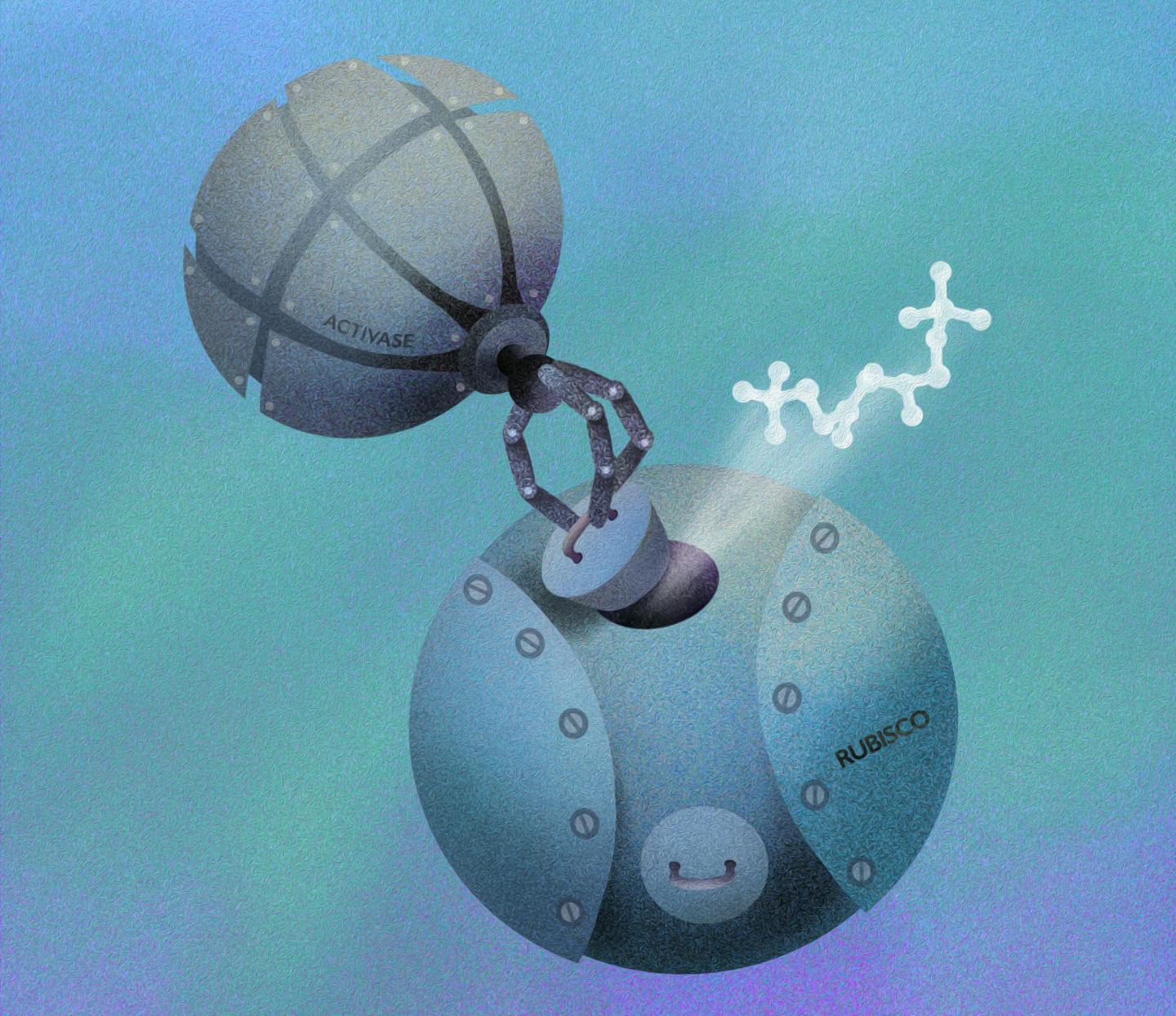 image: Rubisco activase catalyzes the opening of the active site pocket of Rubisco and facilitates release of the inhibitory sugar. The image is an artistic interpretation of the mechanism. Artwork: Julia Kuhl