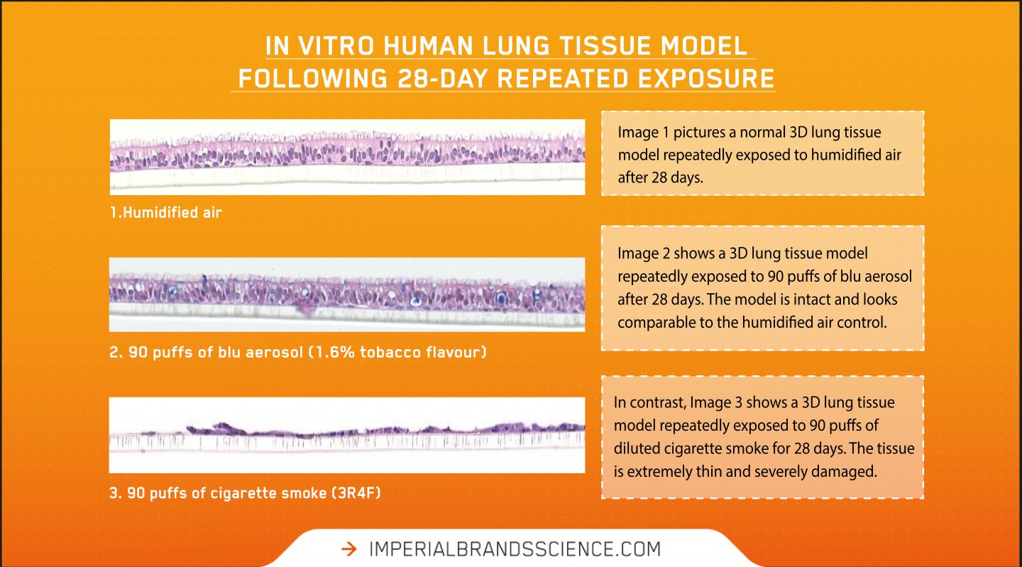 5 May 2021, Bristol - In one of the most advanced applications of in-vitro 3D human lung models in vape research to date, a new peer-reviewed Imperial Brands study shows that, unlike combustible cigarette smoke, blu aerosol had little to no impact on numerous toxicological endpoints under the conditions of test using laboratory models.