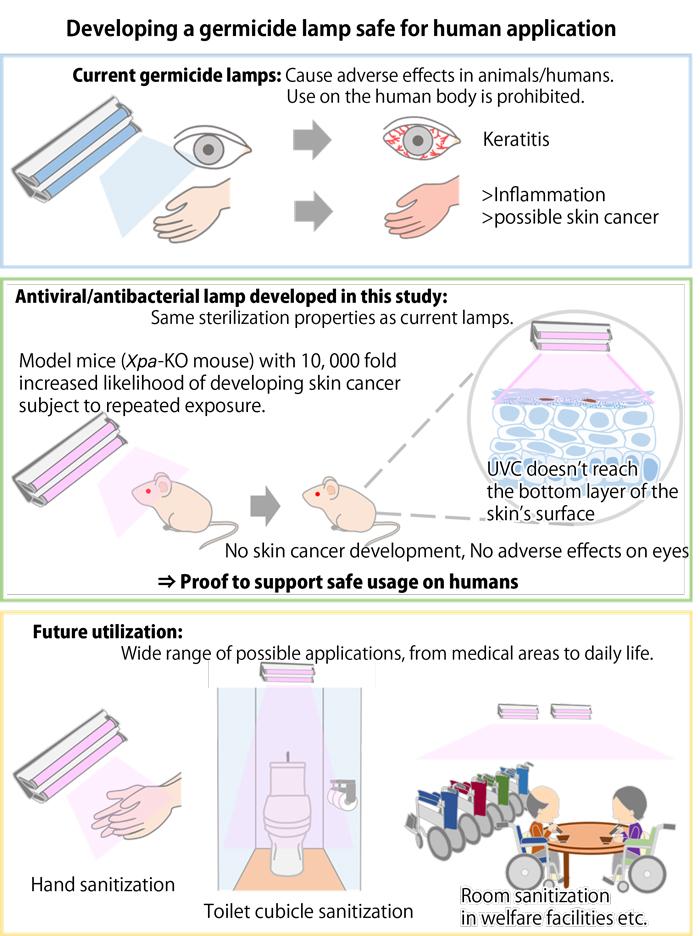 Joint research between Kobe University and Ushio Inc. has provided proof for the first time in the world that direct and repetitive illumination from 222nm ultraviolet radiation C (UVC), which is a powerful sterilizer, does not cause skin cancer. This suggests that 222nm UVC is also safe for human eyes and skin. This technology is expected to have a wide range of antibacterial and antiviral applications in medical facilities and daily life.
