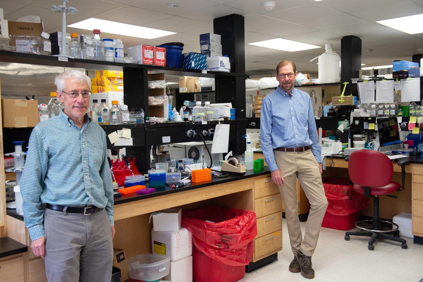 image: Stanley Perlman, MD, PhD, professor of pediatrics, and of microbiology and immunology, and Paul McCray, MD, professor of pediatrics, and of microbiology and immunology, stand in a lab at the University of Iowa Roy J. and Lucille A. Carver College of Medicine. Perlman and McCray report that a mouse model previously created to study SARS can develop symptoms of both severe COVID-19 (lung damage, blood clots, abnormal blood vessels, and death) and also of milder disease, including loss of the sense of smell.