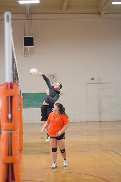 image: Students play volleyball in a physical activity class.