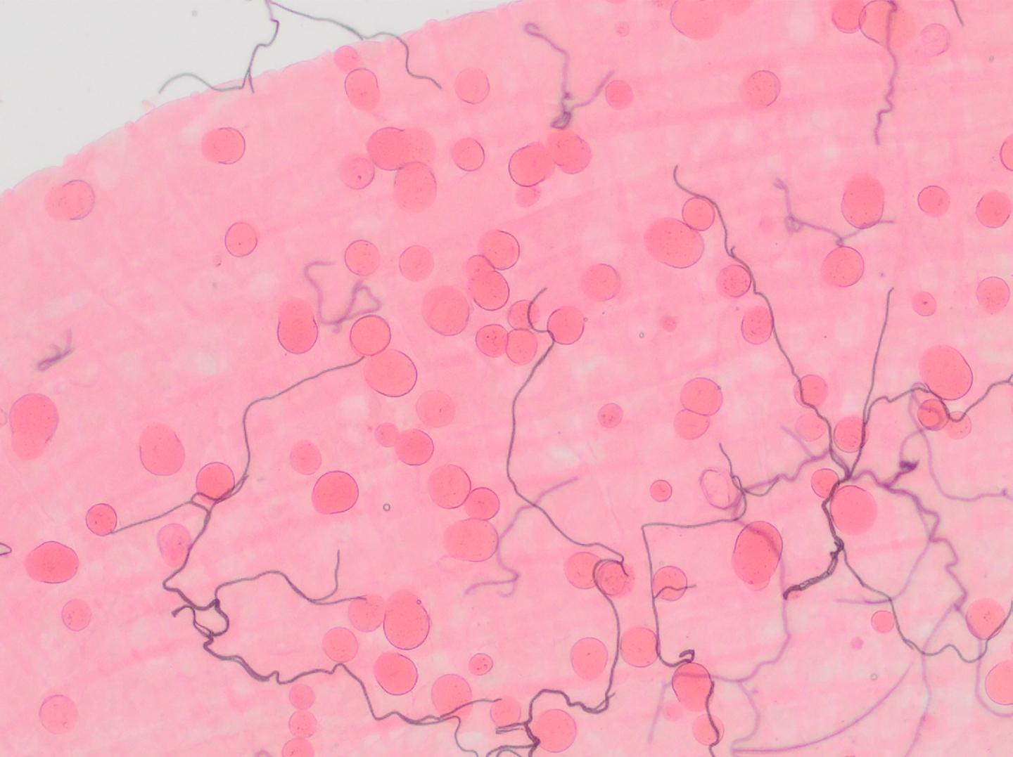 image: The oocyst stage of Plasmodium falciparum parasites developing on the midgut of an Anopheles gambiae mosquito. Image courtesy W. Robert Shaw of Harvard University's T.H. Chan School of Public Health.