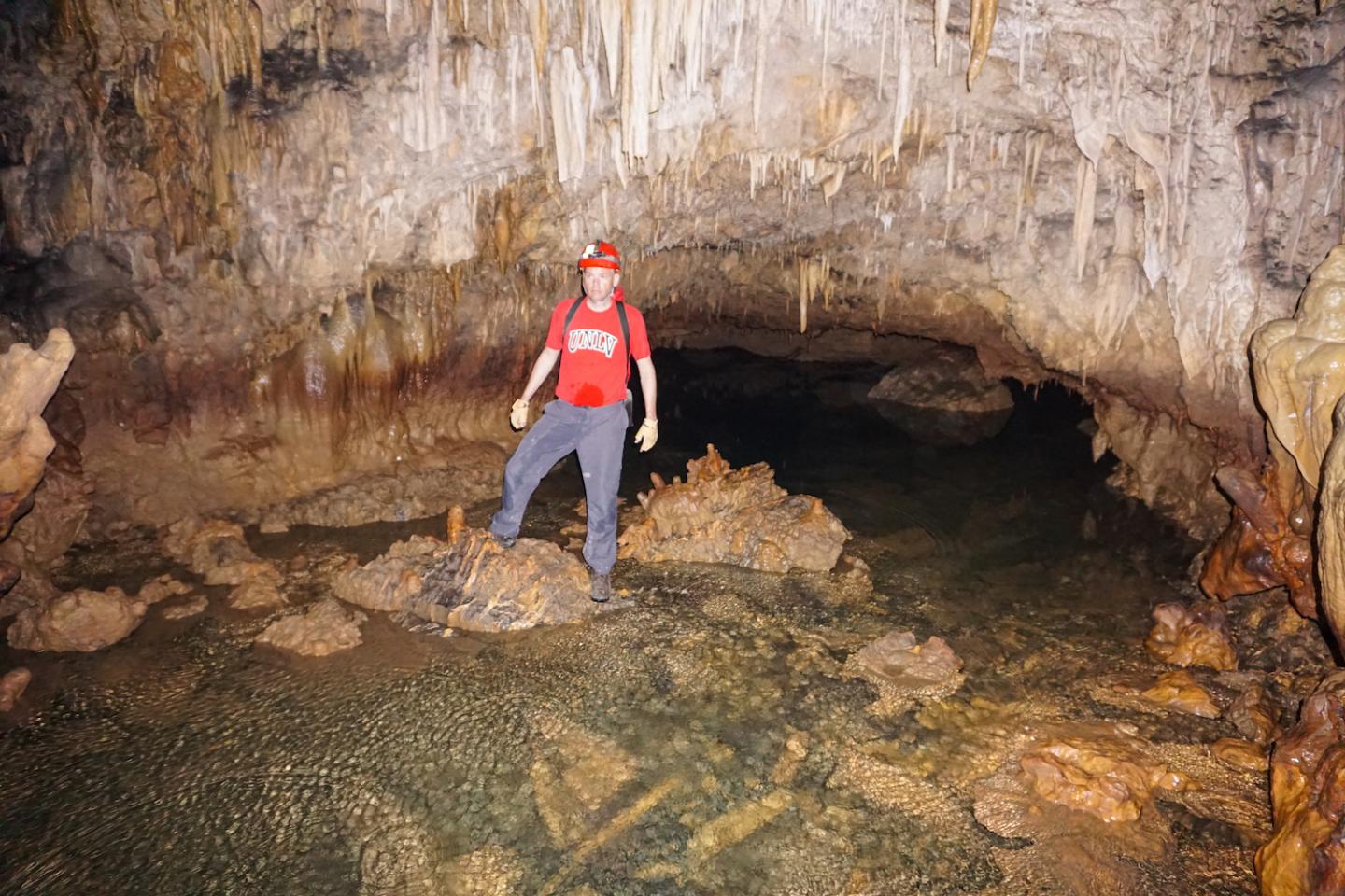 image: Matthew Lachniet, professor and chair of the geoscience department at UNLV, completes field work underground in Rey Marcos Cave, Guatemala, which is a subterranean wonder of stalactites, stalagmites, and a disappearing river.