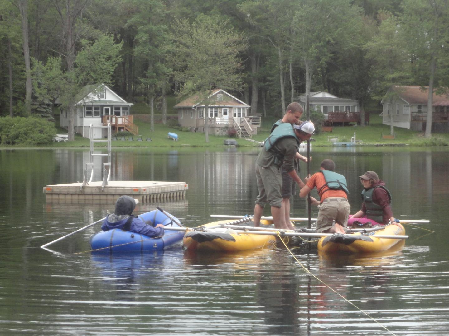 image: University of Wyoming undergraduate students work with Bryan Shuman (in small boat), a UW professor of geology and geophysics, to collect sediment core samples from the bottom of small lakes in the northeast United States as part of a study of ancient droughts. Pictured, from left, are Nicolas Mores (wearing hat), Ryan Davis, John Calder (a Ph.D. student) and Sara Burrell.