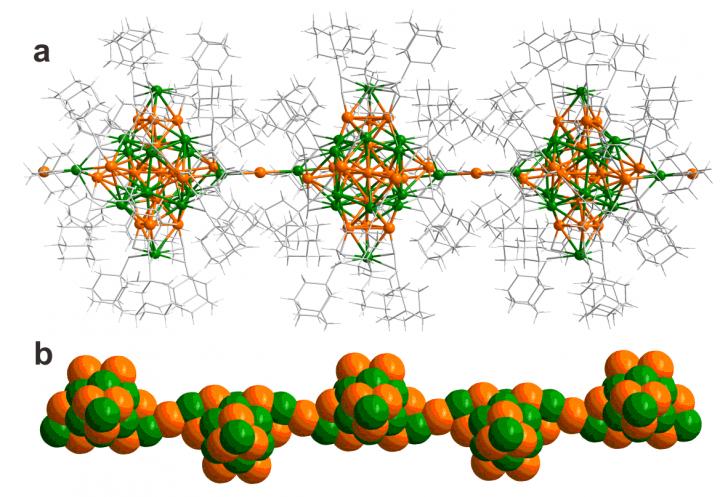 image: Figure a: Visualization of a linear polymer of the 34-atom silver-gold clusters with the inter-cluster metal-metal bonding in the horizontal direction (gold: orange, silver: green, ligand molecules (ethynyladamantane) are shown by grey sticks). Figure b: Shows the packing of metal atoms in the cluster polymer in a view rotated 90 degrees about the horizontal axis.