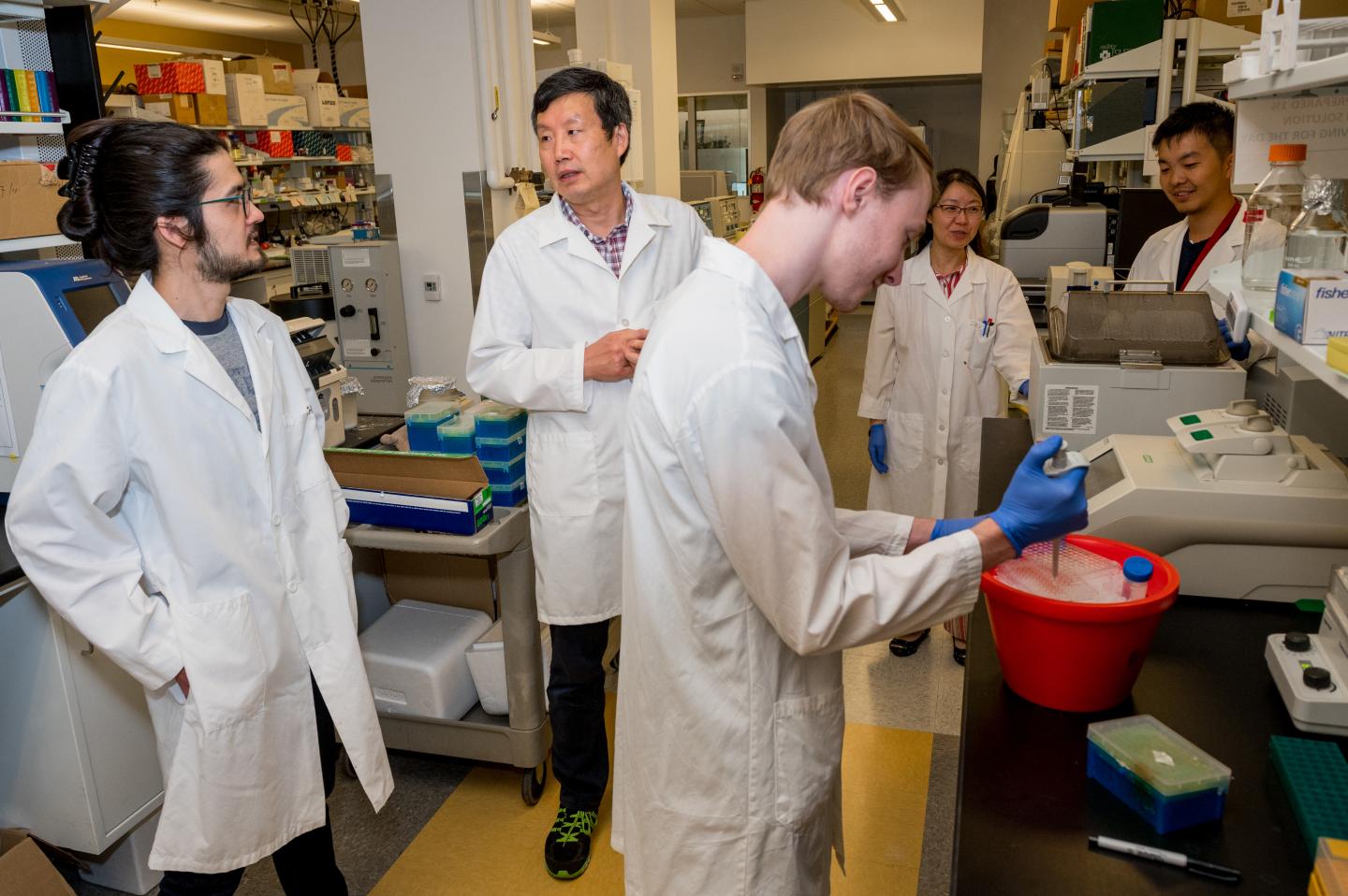 image:Â Jiyue Zhu (second from left) talks to members of his research team inside his laboratory on the WSU Health Sciences Spokane campus, including Ken Porter (far left), Sean Mcgranaghan (center), Fan Zhang (second from right), and Jinlong Zhang (far right).