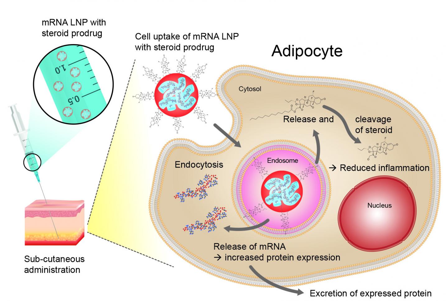 So far, only small, insufficient quantities can be safely injected subcutaneously. Current studies from researchers at AstraZeneca and the Jülich Centre for Neutron Science (JCNS) show how this problem can be solved. The scientists supplemented the mRNA packaging with precursors of anti-inflammatory substances from the class of steroids. The body's own enzymes can convert these precursors into effective steroids at the site of injection.