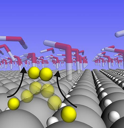 image: A new study shows that hydrogen atoms are loosely bound and highly mobile on the surface of a platinum catalyst during the water splitting reaction. The findings explain why platinum is so good at catalyzing this particular reaction, and could aid in the design of catalysts made of materials that are cheaper and more plentiful than platinum.