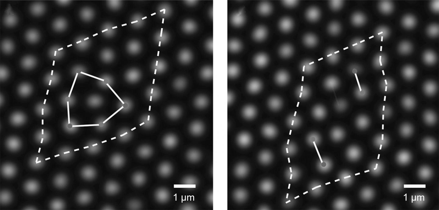 For this new study, the researchers used tiny polystyrene particles suspended in highly deionized water. Electrical forces between the charged particles cause them to arrange themselves in a crystal-like lattice similar to the way atoms are arranged in a solid material. Using a laser beam to move individual particles, the researchers can see how lattice defects affect the order of the lattice.