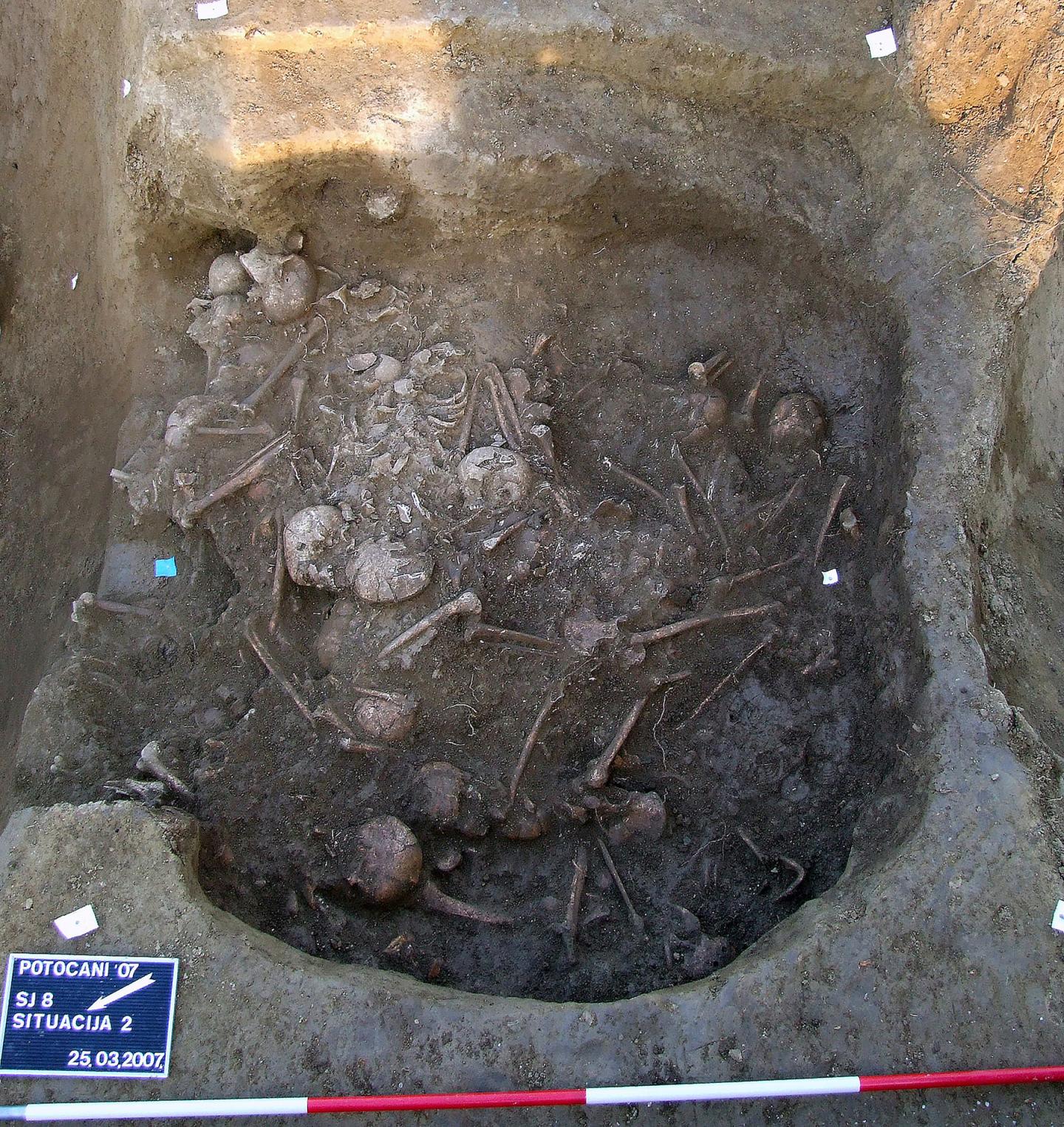 image: The upper layers of the Potočani mass burial shows numerous commingled skeletons.