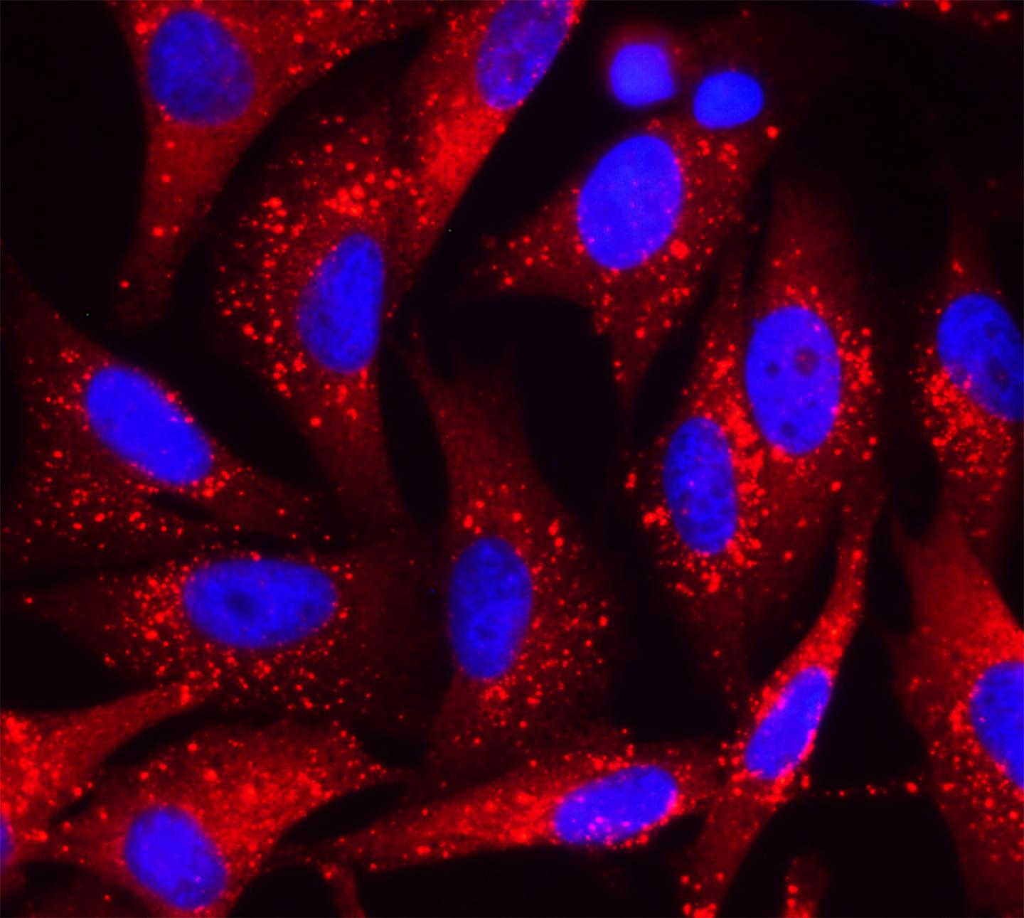 image: New drivers of metastasis in melanoma that define poor prognosis in patients: In red, imaging by fluorescence microscopy of p62 in melanoma cells. Red foci correspond to large complexes of p62 with other proteins that potentiate the ability of these tumor cells to survive, proliferate and invade distal organs.