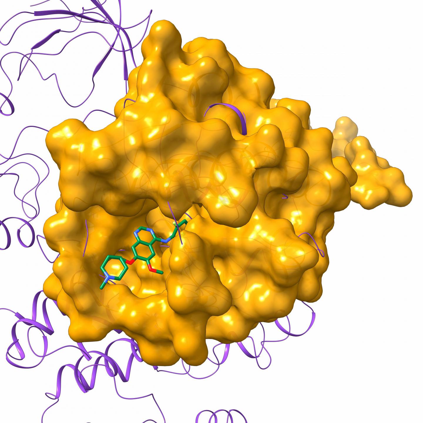 image: Chemotherapeutic vandetanib bound to its main target Protein Tyrosine Kinase 6 (PTK6) in purple, which is involved in many cancers including gastrointestinal tumors and ovarian cancers. By modeling vandetanib and PTK6 complex, researchers at LSU found that the KRAS protein to also contain a similar drug-binding site and therefore to be a good match for the same drug. The computer-generated model of KRAS in gold with vandetanib depicts the predicted interaction.