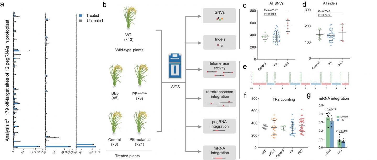 image: a, PE rates at endogenous on-target and off-target sites. b, Experimental design and work flow of whole-genome sequencing. c, d, Numbers of SNVs (c) and Indels (d) identified by WGS in the control, PE and base editor (BE3) groups. e, Genome-wide landscape of the distribution of telomere repeats in the Zhonghua11 genome. f, Comparison of number of reads with more than five TRs per million raw reads in the WT, AGL1, control, PE and BE3 groups. g, Comparison of the percentages of reads in the Cas9 and HPT coding regions versus in the whole T-DNA fragment.