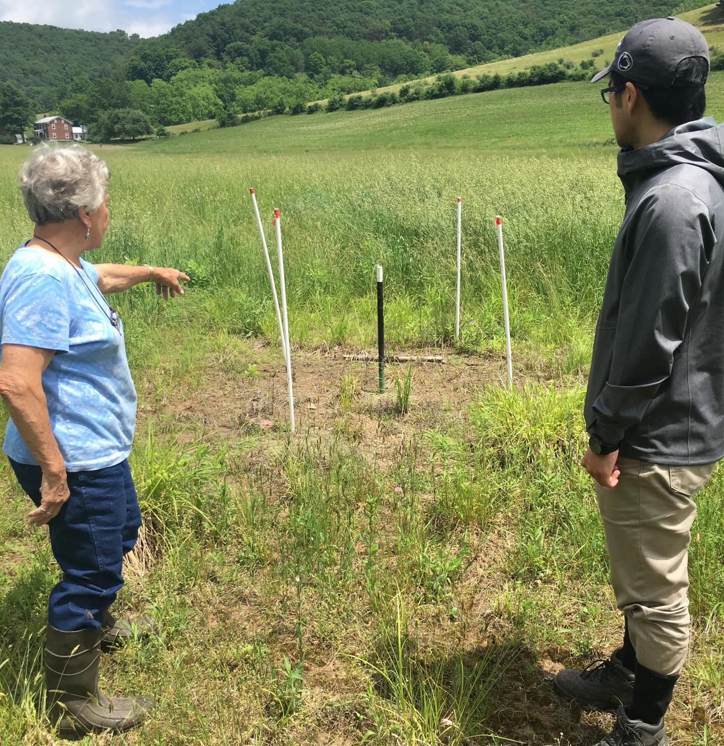 image: Tao Wen (right), a postdoctoral scholar in the Earth and Environmental Systems Institute at Penn State, examines a dead vegetation zone on a farm in the Gregs Run watershed, Lycoming County.