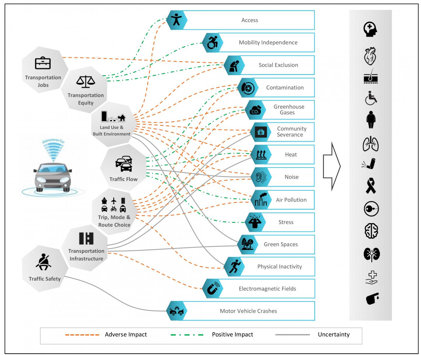 The model serves researchers in the fields of transportation engineering and urban planning as well as automotive makers, health sectors and policymakers to identify the potential pathways through which AVs can affect public health, and to investigate the impacts, quantify them and develop policies to mitigate them.