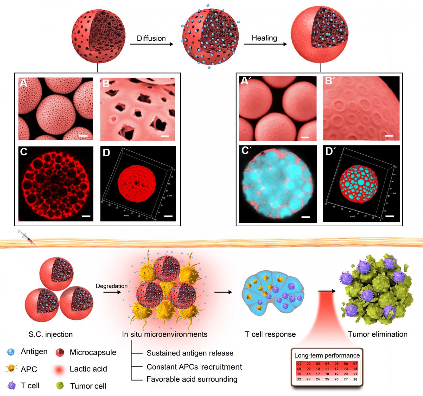 The special self-healing feature provides a mild and efficient paradigm for antigen microencapsulation. After vaccination, these microcapsules create a favorable immunization microenvironment in situ, wherein antigen release kinetics, recruited cell behavior and acid surrounding environment work in a synergetic manner.