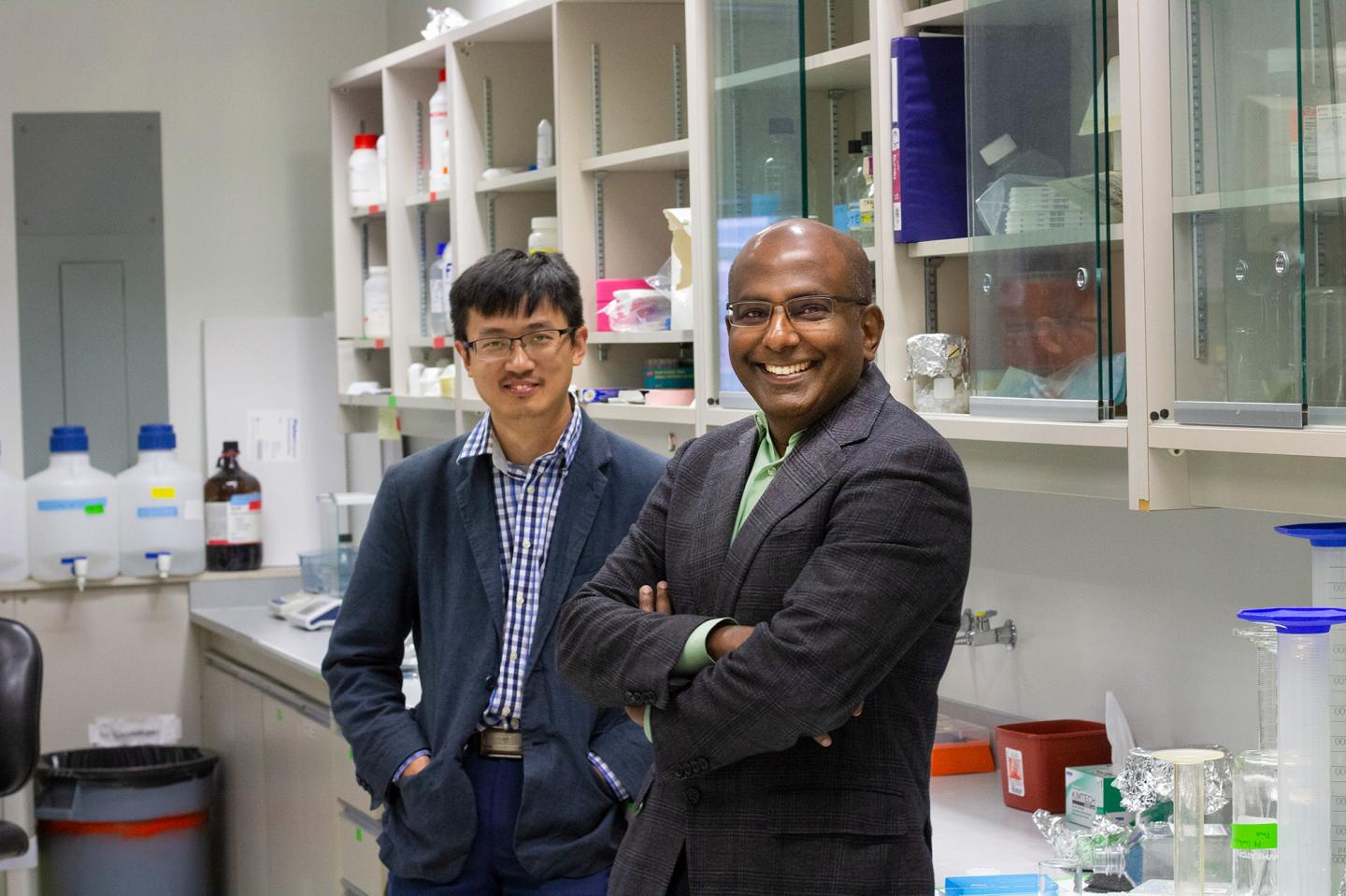 image: Cardiologist Gavin Oudit (right) and research assistant Wang Wang in the lab. Oudit's team is developing a new treatment that could eventually help protect people from cardiovascular disease, particularly abdominal aortic aneurysms.