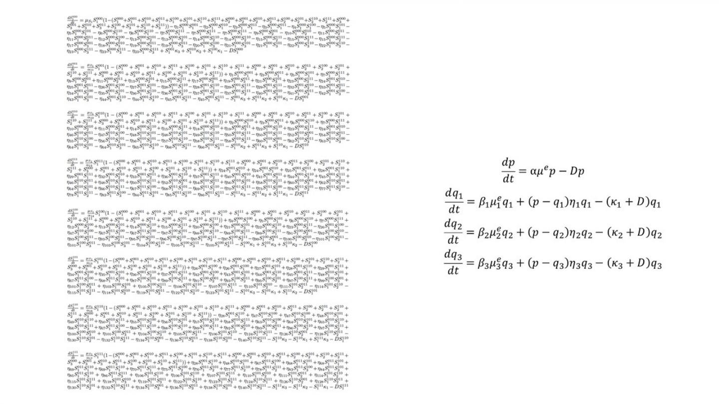 image: The list of equations required to model three plasmids being swapped in one bacterial species using the old method (left) versus the new, simplified model's equations (right).