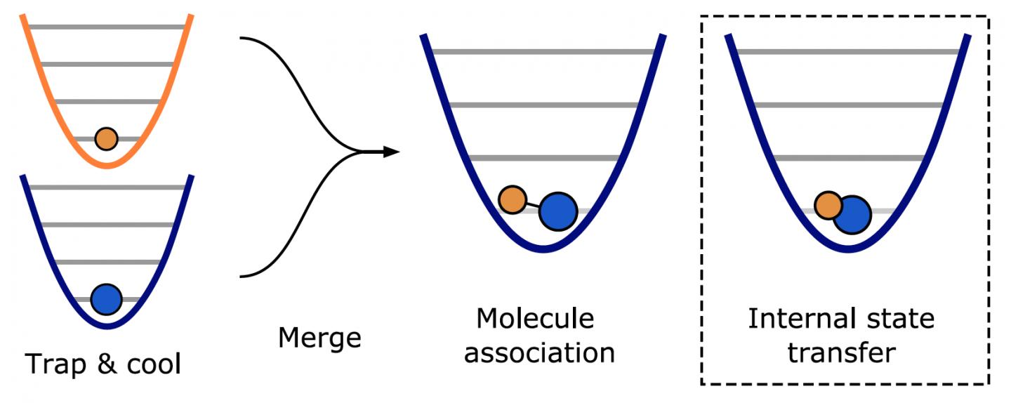 image: The above diagram shows part of the molecular assembly process from individually trapped atoms to ground state molecule using optical tweezers (lasers).