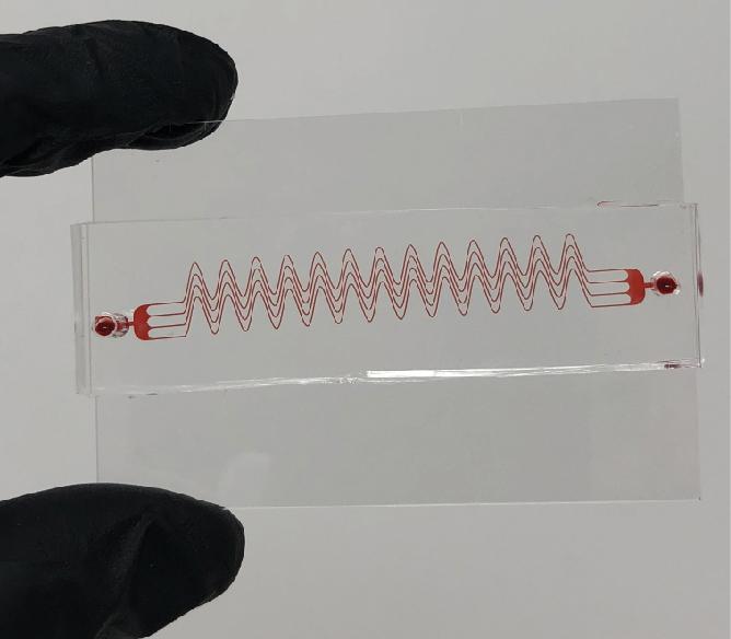 image: The red lines in this photo are the microfluidic device Dr. Abhishek Jain and his team have developed to help detect blood clots.
