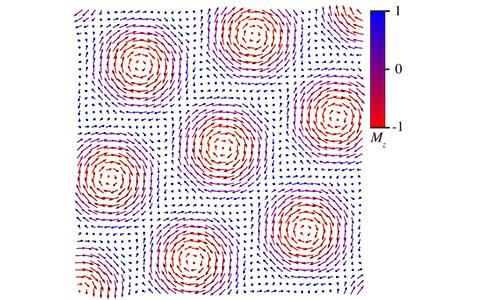 image: Schematic illustration of the magnetic skyrmions in MnSi. Arrows stand for magnetic moments in MnSi. Red arrows indicate that corresponding moments have negative out-of-plane components, whereas blue ones positive.