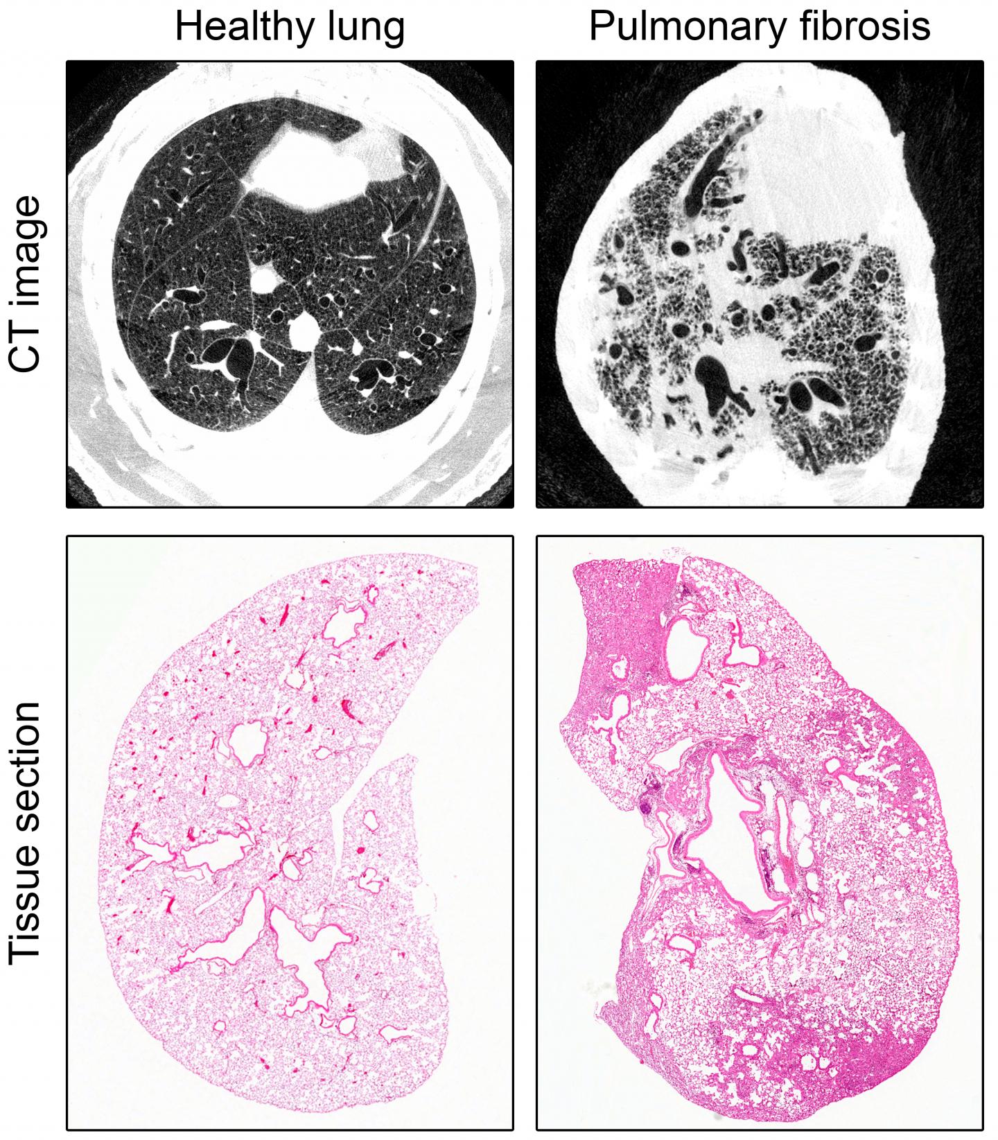 image: CT images and tissue sections show how healthy, air-filled tissue is replaced by thickened, stiff connective tissue.