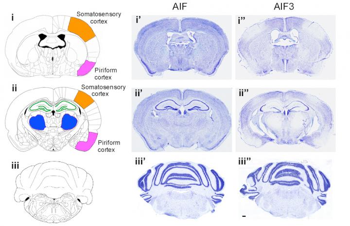 image: AIF3 splicing triggers neurodegeneration and neuron loss in a mouse brain, shown in the cortex (orange and pink), hippocampus (green), and thalamus (blue).