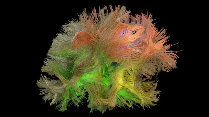 image: Brain with its fibers showing its immense complexity. The new machine learning method can isolate patterns in brain signals that relate to a specific behavior and decode the behavior much better.