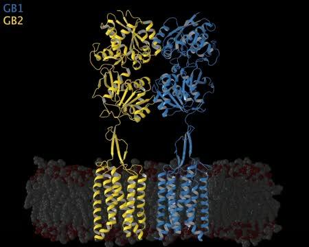 video: The activation transition for the GABAB receptor. GABAB comprises two distinct parts, GB1 and GB2. In the first step toward activation, researchers added an agonist, a GABA-like molecule that brings the pieces of GB1 and GB2 that sit outside the cell together. In the second step, the team added a molecule called a positive allosteric modulator, or PAM, which together with the agonist stabilized GABAB in its active form.