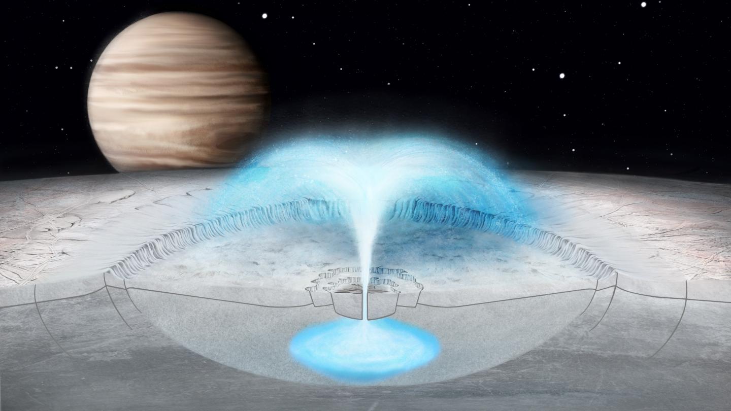 image: This artist's conception of Jupiter's icy moon Europa shows a hypothesized cryovolcanic eruption, in which briny water from within the icy shell blasts into space. A new model of this process on Europa may also explain plumes on other icy bodies.