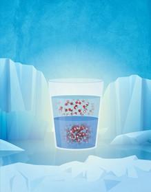 image: The above graphic offers a conceptual view of how water can exist in two liquid states separated by a thin interface. The bottom liquid is more dense than the one on top, because it is composed of water molecules that are more cosely packed.