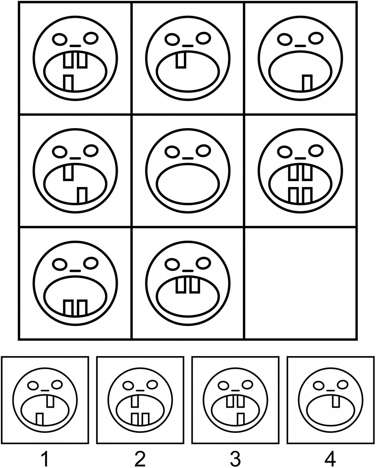 image: A sample Raven-like matrix problem. Participants have to fill in the lower right corner of the visual matrix with one of the four alternatives by figuring out the principle of the matrix organization. Item created by Maria Falikman.