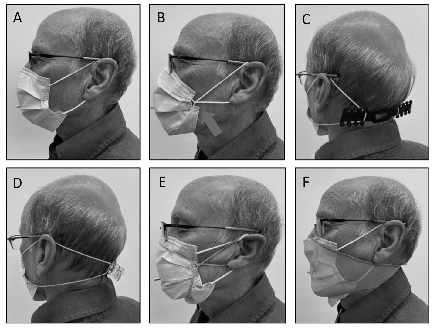 image: Medical procedure mask and modifications designed to enhance mask fit or comfort for the wearer. A mask w/ear loops (A) modified by tying the ear loops and tucking in the side pleats (B), attaching ear loops to a 3D-printed "ear guard" (C), fastening ear loops with a 23mm claw-type hair clip placed behind the wearer's head (D), placing ring of three, ganged, rubber bands over the mask and around the wearer's ears (E), and sliding a 10-inch segment of nylon hosiery over the fitted mask (F).