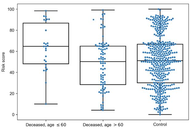 image: The risk score suggested by the researchers (vertical axis) is considerably higher in the group of patients suffering severe COVID-19 (sample of patients from Moscow)