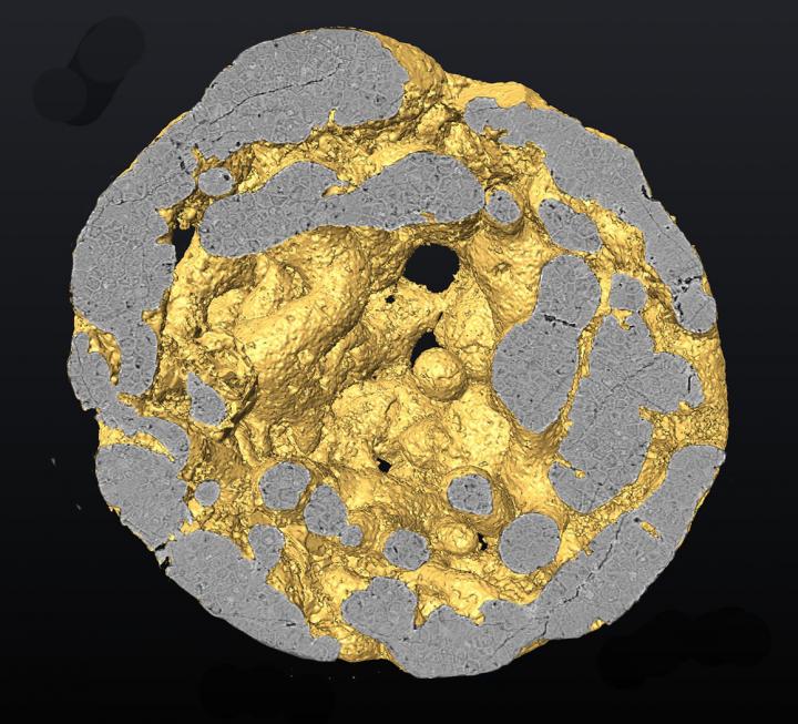 image: Three-dimensional reconstruction of a Caveasphaera specimen, showing cell structures.