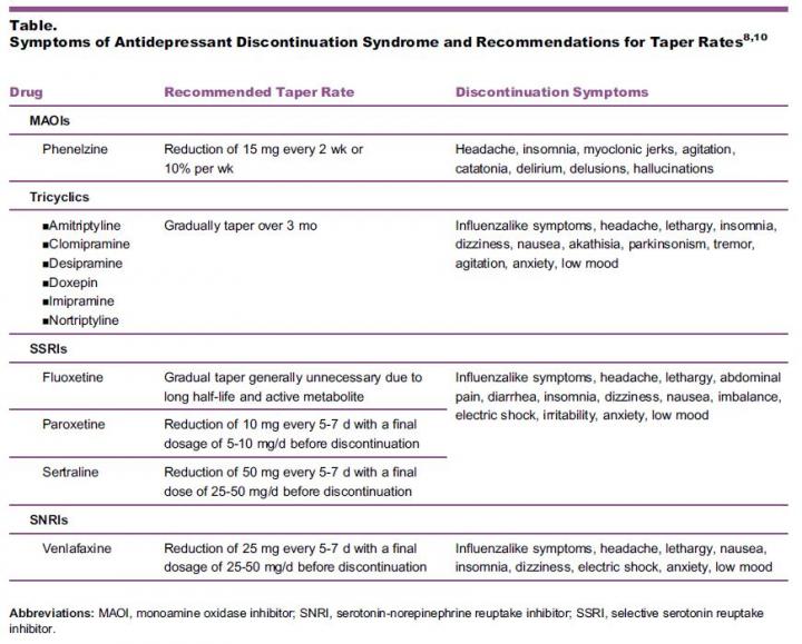 image: Researchers provide a schedule for gradually reducing dosage for each class and type of antidepressant, along with associated withdrawal symptoms for which patients and physicians should monitor.