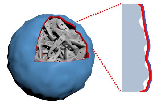 image: A depiction of the microsized silicon anode particle covered by solid electrolyte interphase, or SEI.